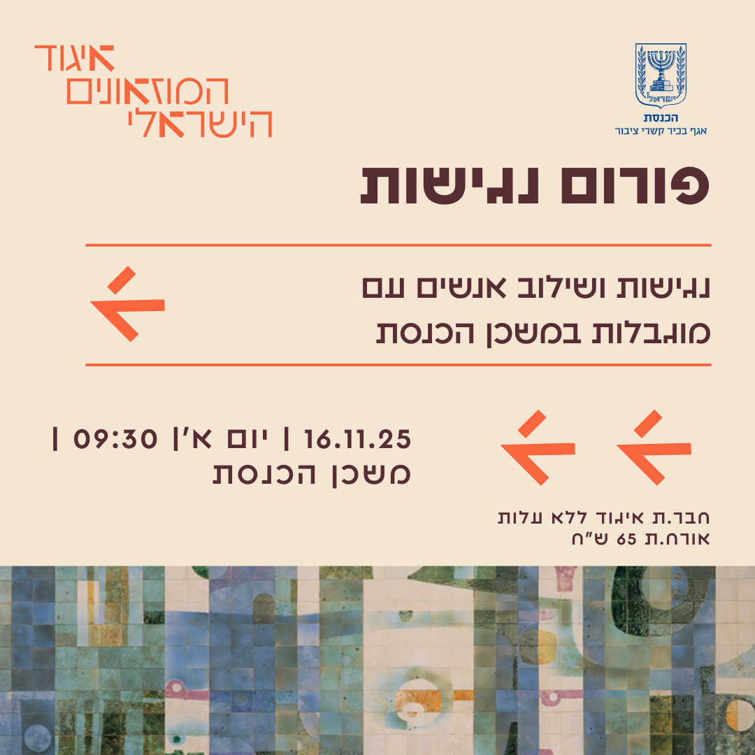 פורום נגישות גאה להזמין לסיור במשכן הכנסת בו נכיר מקרוב את ההתאמות הפיזיות, הטכנולוגיות והדיגיטליות שנעשו במשכן, נשמע על שילוב עובדים עם מוגבלות בשירות הציבורי, וניחשף לפעילות ועדות הכנסת בתחום. היום יתקיים בהנחיית מר אלון יעקב, ממונה נגישות ובטיחות במשכן הכנסת ובשיתוף עם מרכז המבקרים. בחלק השני של היום נפגוש את גב' שרון סופר, אוצרת האמנות של המשכן שתציג את האוספים הייחודיים תוך דגש על נגישות חווייתית ותיווך אמנות לאנשים עם מוגבלות.