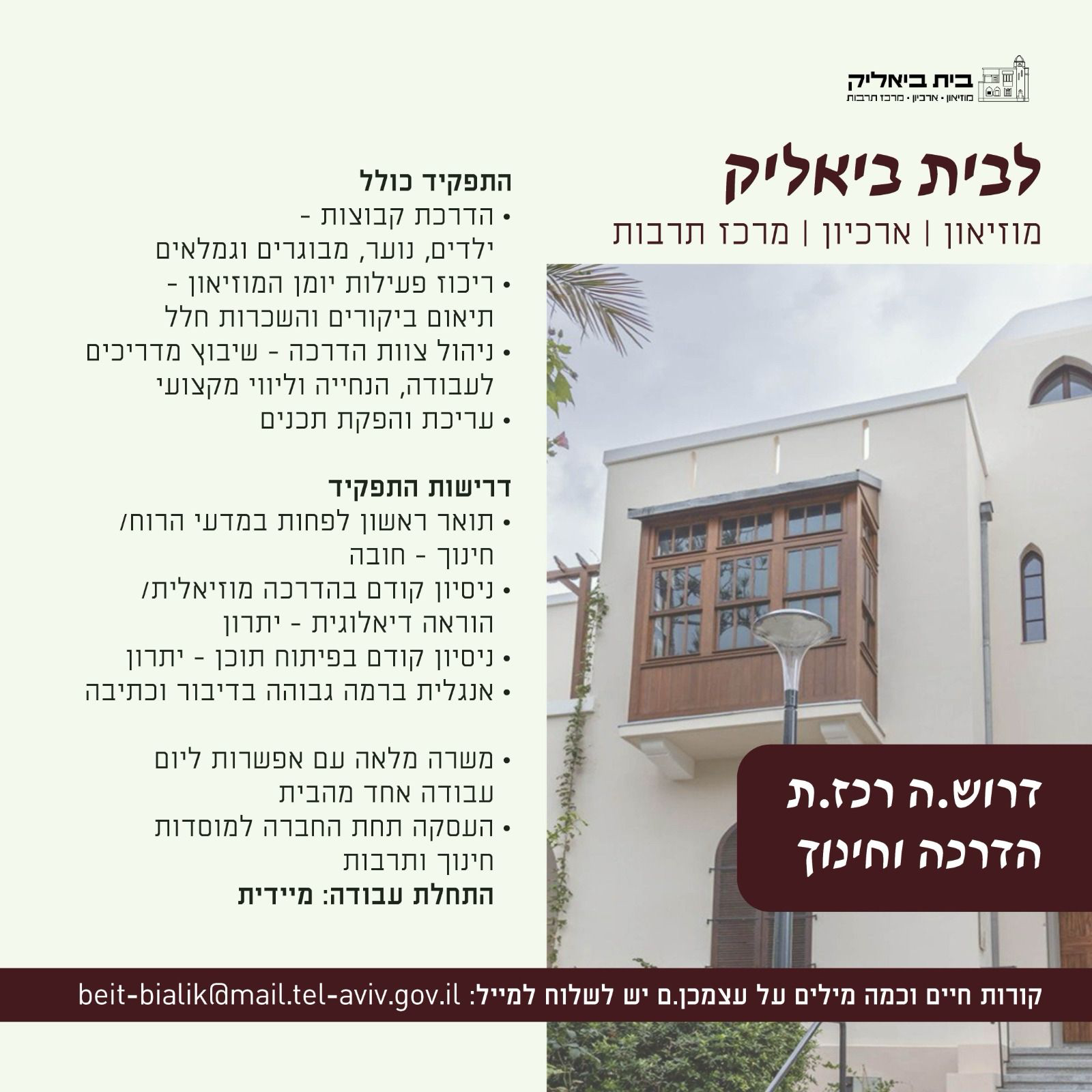 לבית ביאליק דרוש.ה רכז.ת הדרכה וחינוך